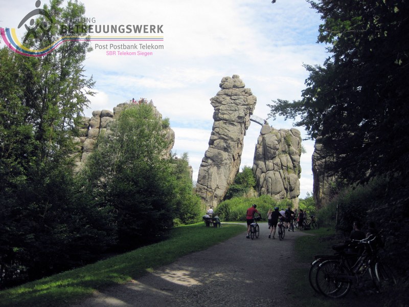Bereits um 09:20 Uhr saßen wir im Zug Richtung Detmold. Dort angekommen brachte uns ein Radfahrerbus zum Hermannsdenkmal. Vom 54 Meter hohen Denkmal hatte man tollen Ausblick über den Teutoburger Wald. Aber dann war Schluss mit lustig. Ab jetzt war die Muskelkraft gefordert. Eine kurze rasante Abfahrt nach Detmold und weiter mit einigen kräftigen Anstiegen Richtung Externsteine bei Horn Bad-Meinberg. Selbstverständlich wurden die 38 Meter hohen Felsformationen über steile Treppen und Stiege erklommen. Die Mühen wurden mit einer herrlichen Aussicht belohnt. Die Mittagspause wurde in der Ortschaft Schlangen bei einem Schützenfest, das im 2-jährigen Rhythmus in den geraden Jahren veranstaltet wird, eingelegt. Nächstes Ziel war Bad Lippspringe mit der Quelle der Lippe. Von dort war es nicht mehr weit bis zum Ausgangspunkt in Paderborn. Mit gefahrenen 51 Km hatten wir uns das Abendessen im Paderborner Brauhaus redlich verdient. Schweinesteak 400 Gramm!!!