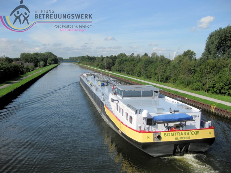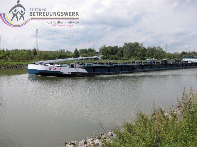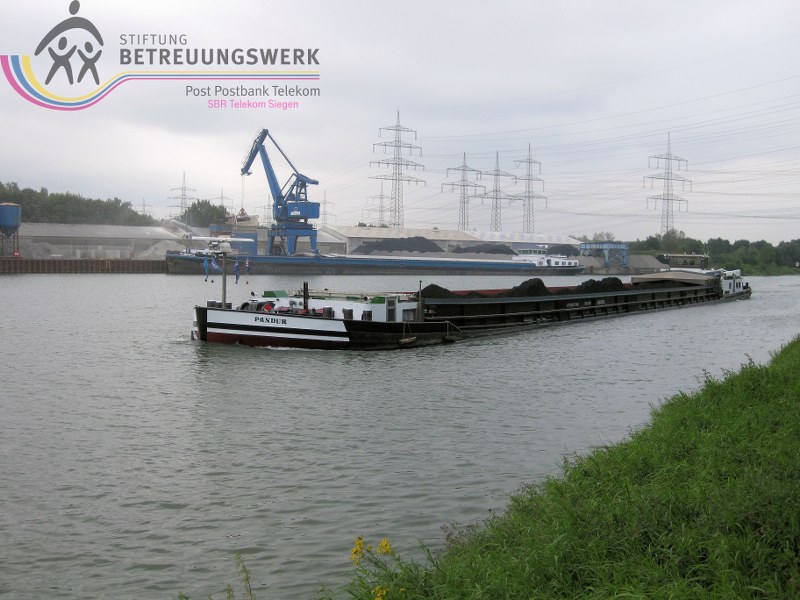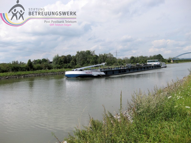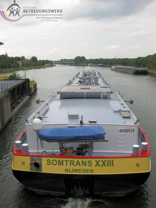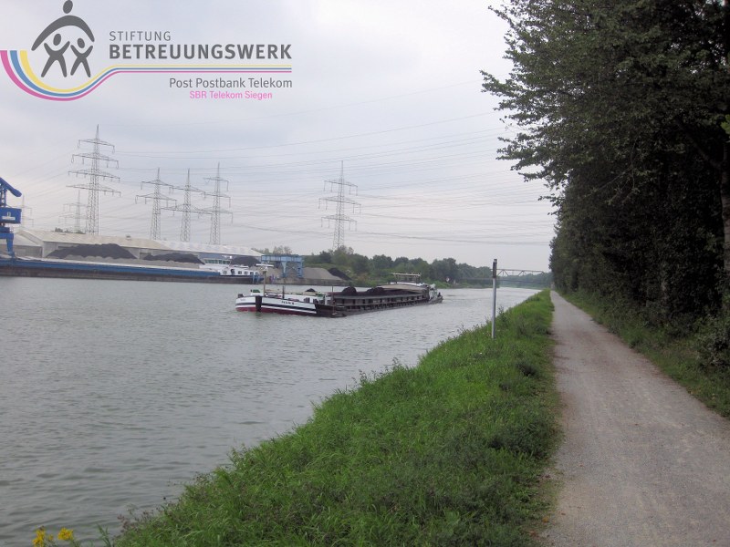 Abfahrtszeit wie immer und wieder eine sehr schöne Tagesetappe. Abweichend von der Originalstrecke fuhren wir die Victoria-Schleife. An Marl vorbei und durch Dorsten, ab hier wieder Originalstrecke, wurde die Mittagspause bei einer Fischzuchtanlage in der Nähe von Gahlen eingelegt. Der frisch geräucherte Fisch war eine Delikatesse. Nächste Pause war beim Schloss Gartrop. Ein imposantes Anwesen. Der „Höhepunkt“ des Tages ließ nicht lange auf sich warten. Kurz vor Wesel wollten wir die Selbstbedienungsfähre über die Lippe benutzen. Einen Kilometer vorher wurde der Himmel auf einmal schwarz. Zum Glück waren wir gerade bei einem Bauernhof mit dem Namen „Ufermannshof“. Gerade noch rechtzeitig fanden wir unter einem Carport Unterschlupf und das Unwetter brach über uns herein. Nach einer guten halben Stunde verzog sich aber wieder das Gewitter und der Regen. Über einen nassen Feldweg erreichten wir schließlich die Fähre. Nach einigen Startschwierigkeiten setzten wir endlich die Fähre in Betrieb und erreichten trockenen Fußes das andere Ufer. Von dort waren es noch einmal 5 Km bis zum Hotel, das Haus Duden. Insgesamt hatten wir an diesem Tag 59 Km zurückgelegt. Die Hotelanlage war riesig. Das merkten wir auch bei den Preisen, denn 4 Sterne müssen ja bezahlt werden. Es sollte kein preiswerter Abend werden, aber das Essen war Spitze.