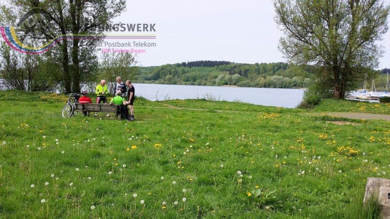 Pünktlich um 09:30 Uhr wurde beim Parkplatz Skilift Stein-Neukirch gestartet. 16 Fahrerinnen und Fahrer waren zum Start auf den hohen Westerwald gekommen. Die Strecke, von Berthold ausgearbeitet, sollte sich als ein Highlight heraus kristallisieren. Bei strahlendem Sonnenschein fuhren wir anfangs fast nur bergab über Ober– und Niederroßbach und Neustadt bis oberhalb von Rennerod. Nach einigen Kilometer über Nebenstraßen und Radwegen fuhren wir an dem noblen Wiesenseehotel mit Golfplatz vorbei. Dann immer am Wasser entlang bis nach Pottum. Dort legten wir die erste größere Pause ein (in Bildergalerie Bild Wiesensee 1 + 2). Vom Wiesensee bis zum Secker Weiher war es nur ein Katzensprung. Bei der Einfahrt zum Campingplatz sollte noch der 17. Teilnehmer zu uns stoßen. Nach kurzer Fahrstrecke erreichten wir schließlich die Ortschaft Seck. Die Strecke führte dann weiter nach Waldmühlen und Rennerod. In Rennerod dann ein steiler und langer Anstieg bis zur Siedlung Kohlau (in Bildergalerie Bild Rennerod 1 + 2). Nach wenigen Kilometer erreichten wir nun die „Alte Bahnstrecke Rennerod – Herborn“. Ein herrlicher Radweg führte uns bis zur Wasserscheide Dill/Lahn. Von dort weiter bis zum Campingplatz Krombachtalsperre. Dort legten wir in der Gaststätte „Ponte Rosa“ die verdiente Mittagspause ein. Da das sehr gute Essen etwas auf sich warten ließ, wurde die Rast etwas länger als geplant (in Bildergalerie Bild Krombachtalsperre 1 + 2). Nach der Stärkung wieder ein kurzes Stück zurück bis zur alten Bahntrasse. Kurz vor Rehe wurde diese verlassen und wir fuhren in den Ort rein. Hier konnte man das sehr schöne alte Rathaus bewundern. Nun kamen das Ziel bzw. der Ausgangspunkt immer näher, aber die dunklen Wolken auch. Von einigen Regentropfen begleitet fuhren oberhalb der Breitenbachtalsperre nach Waigandshain bis Nister-Möhrendorf (im Volksmund Karottendorf genannt). Dort überquerten wir die stark befahrene Bundesstraße. Ab hier nun immer bergauf über Bretthausen wieder bis zum Ausgangspunkt in Stein-Neukirch. Kaum angekommen, stellte sich dort sintflutartiger Regen mit Gewitter ein. Aber alle hatten sich noch schnell in ihre Autos „retten“ können.