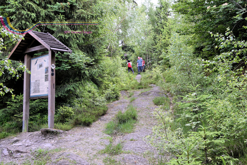 Kurz wurde über das 1200 Jahre alte Dörfchen Raumland (ehemals Rumilingene), einem Stadtteil von Bad Berleburg informiert und schon wanderten wir über die Haltestelle Raumland der ehemaligen Bahnlinie Abzweig Hörre – Allendorf (Eder). Diese Bahnlinie wurde 1911 erbaut, bereits 1890 wurde jedoch die Bahnlinie Erndtebrück – Raumland-Markhausen erbaut. Erst im Jahre 1910 wurde die Verbindung Raumland-Markhausen – Berleburg vollendet. Dadurch erhielt das kleine Dörfchen Raumland einen Bahnhof (1890 Kopfbahnhof, ab 1910 Durchgangsbahnhof) und eine Haltestelle für Raumland-Ort. Die Bahnlinie nach Allendorf-Eder wurde 1981 stillgelegt und im folgendem Jahr auf NRW-Gebiet abgebaut und dient heute als Ederauenradweg. In Hessen führt er nun den Namen Eder-Radweg und endet bei der Einmündung der Eder in die Fulda bei Edermünde.