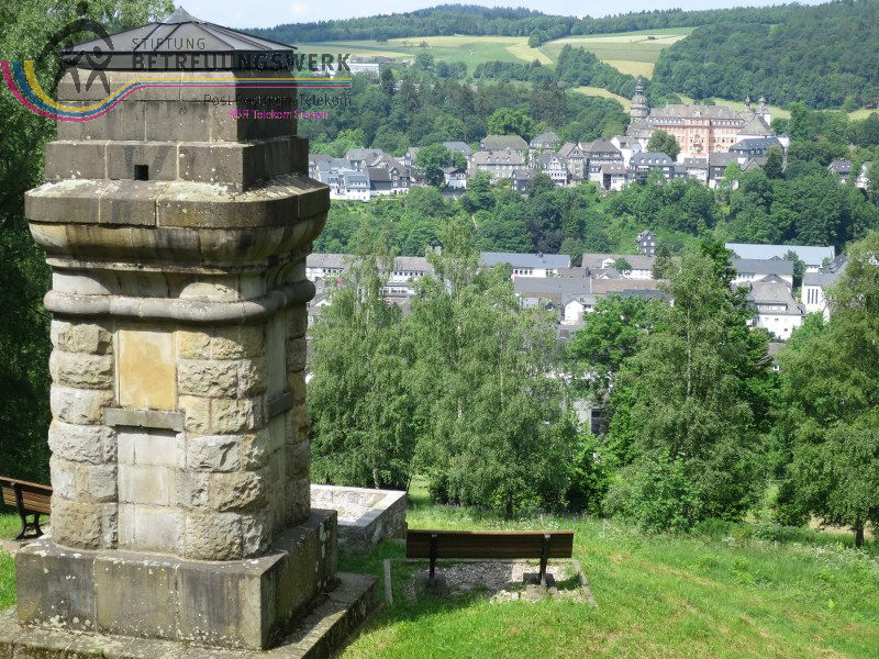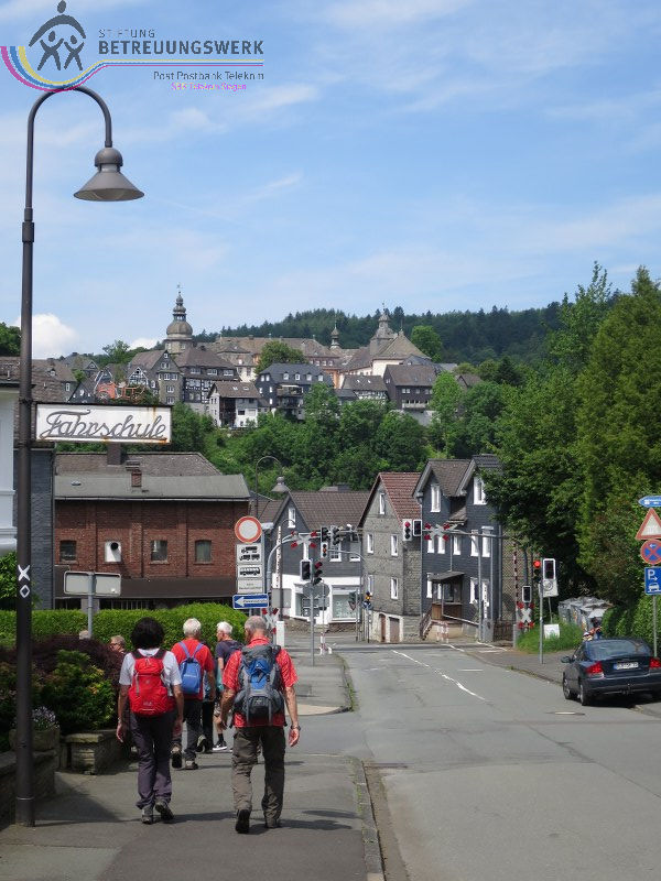 Durchs Steinbachtal hinab ging es auf die Lenne (Die Bezeichnung „Lenneberg“ hat seinen Ursprung im Germanischen. Früher bezeichnete man mit „Lenne“ oder „Linne“ einen Mischwald aus Kiefern und Ahorngewächsen, worunter man aber auch waldbedeckte Hänge bzw. Berge verstand) hinauf zur Ortschaft Berleburg. Wir wanderten oberhalb der Bebauung zur Bismarcksäule und rasteten mit schönen Blick auf das Schloß Berleburg. Nach der Stärkung gingen wir hinunter in die Stadt Bad Berleburg (Bismarckstr., Schützenstraße, Unterkreuzung der Bahnlinie Siegen – Bad Berleburg, Wiesenweg, Ludwigsburgstr., Poststr., Tiergartenstr.), an der Ludwigsburg vorbei, in den Schloßpark. Die Idylle Schloßpark wird von der Stadt als Kurpark mitbenutzt. Beim Verlassen des Parks begegnete uns S.D. Prinz Richard und Prinz Gustav. Kurz durch das Berlebachtal wanderten wir unterhalb der Reha-Kliniken Odeborn und Rothaar, oberhalb des Friedhofes zum Sengelsberg. Dort hatten wir wieder schöne Aussichten auf Bad Berleburg. Im weiteren Verlauf ergaben sich Aussichten auf Berghausen, Raumland-Markhausen, den Windrädern in Weidenhausen und der Radomkuppel in Erndtebrück, sowie zum Sender Ederkopf.