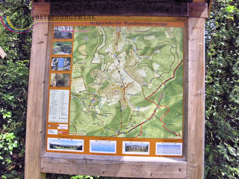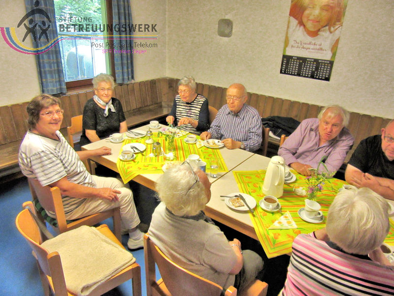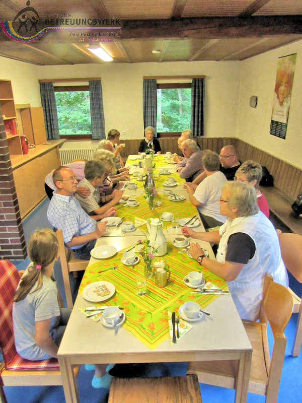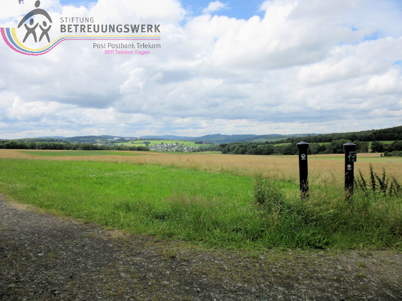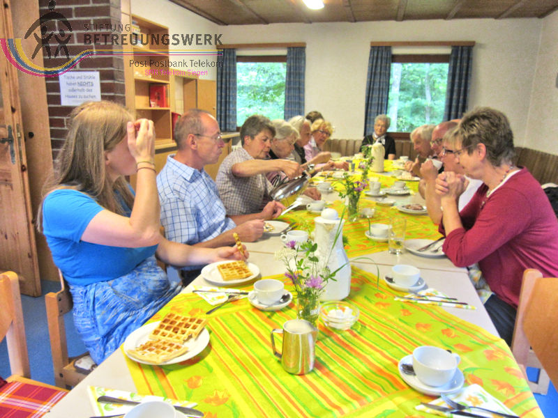 Die Anfahrtsbeschreibung zum Hainer Landheim in Wilnsdorf–Wilgersdorf war eindeutig beschrieben. Allerdings trifft man im letzten Abschnitt unerwartet auf felsigen Untergrund. Und an dieser Stelle kamen bei einigen unserer Wanderfreunde Zweifel auf, ob sie an diesem 13. Juli auf der richtigen Fährte zum Treffpunkt wären. Der holprige Abschnitt (bei angepasster Fahrweise kein Problem!) war schnell vergessen, denn alle zeigten Begeisterung über die ruhige, idyllische Lage. Schnell bildeten sich 2 Gruppen: Susanne scharte die „Spaziergänger“ um sich und für die längere Runde übernahm Achim R. die Führung. Zum Streckenverlauf: überwiegend auf dem A1, zunächst am Komplex der CVJM-Bildungsstätte entlang zum Bergmannsdenkmal. Nur wenige Schritte weiter war der Blick dann frei auf die Anhöhen um Wilnsdorf mit Autohof sowie die Simultankirche auf dem Rödgen und „unseren“ Fernmeldeturm auf der Eisernhardt. Wer dem A1 weiter folgt, gelangt zur Kalteiche. Wir aber nahmen die Abkürzung am Kletterwald vorbei direkt zum Landheim, weil wir nach fast 1 ½ stündiger Gehzeit mal wieder „von den Füßen kommen“ wollten. Inzwischen hatten Jana & Stefan als gute Küchengeister für uns Kaffee gekocht und leckere Schnittchen zubereitet. Damit nicht genug: sogar mit frisch gebackenen Waffeln und „Krübbelchen“* wurden wir verwöhnt! Erwähnenswert ist auch, dass Johanna u. Hanna als österreichische Gäste (Nähe Linz) mit uns gelaufen sind und sich in unserem 14-köpfigen „Pensionärenverein“ wohlgefühlt haben.