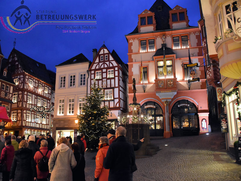 Unsere Fahrt startete pünktlich um 07:30 Uhr vom P&R Parkplatz Leimbachstraße in Siegen. Zunächst fuhren wir über die A 45 bis zur Abfahrt Haiger-Burbach. Von dort ging es zur Lipper Höhe, wo an dem bekannten Zollhaus noch weitere Mitreisende einstiegen. Somit waren wir jetzt mit 57 Personen vollzählig. Weiter ging die Fahrt über den Westerwald und dann über die Autobahn Richtung Trier. Am Autobahnrastplatz Elztal machten wir eine kurze Pause, einige vertraten sich draußen die Füße, andere nutzen die Zeit um sich an dem von Reiseunternehmen bereitgestellten Kaffee zu bedienen. An der Abfahrt Föhren verließen wir die Autobahn und nun waren es nur noch ca. 20 Minuten bis zu unserem Ziel, dem Eurostrand Leiwen, Moselallee 1, in Leiwen. Die Veranstaltung begann mit der Begrüßung und einigen Erläuterungen zum Ablauf des Tages, durch unseren Ansprechpartner Herrn Jens Stoffers und Luuk (=der holländische Lukas) vom Personal des Eurostrands, die unter anderem auch den Koch und die Restaurantleiterin vorstellten. Herr Breil, Regionalstellenleiter Trier, begrüßte uns ebenfalls aufs Herzlichste und gab uns einige Informationen, was sich in den kommenden Jahren ändern wird. Inzwischen hatte das Personal Kaffee, Brot, Schmalz und Gebäck auf den Tischen verteilt. Dieses wurde von allen gut angenommen, galt es sich doch nach der Anreise kurz zu stärken, bevor eine Führung durch das Resort anstand. Um 13:00 Uhr standen wir dann vor der Qual der Wahl von welchen Köstlichkeiten wir uns zuerst am Buffet bedienten. Vielen war das Resort bereits bekannt und auch die, die zum ersten mal mit gefahren waren, wurden von der reichlichen Auswahl nicht enttäuscht. Im weiteren Verlauf des Nachmittags wurde uns eine vom hauseigenen Personal dargebotene Modenschau vorgeführt. Models waren, vorher gefragte Gäste. Inzwischen wurden bereits die Tische mit Kaffee und Kuchen gedeckt. Die kolumbianische Sängerin Shakira hat das Auftaktkonzert ihrer El Dorado Welttournee ja leider abgesagt. Der Höhepunkt der Veranstaltung waren musikalische Darbietungen u.a. mit Sanny und Sabine. Leider war die Akustik in dem Speisesaal nicht so gut, wie einige das von Darbietungen in der großen Lounge gewohnt waren. So kam das Können der beiden nicht wirklich gut raus, zumal die Lautsprecher zu laut eingestellt waren, „schade“. Inzwischen warteten bereits einige auf die Auflösung des vor der Führung durch das Resort, ausgefüllten Rätsels, galt es doch zwei Gutscheine zu gewinnen. Kein Teilnehmer von Siegen hatte gewonnen. Für uns war es jetzt auch Zeit aufzubrechen, da wir auf der Rückreise noch einen Stopp in Bernkastel-Kues einlegen wollten, um über den Weihnachtsmarkt zu bummeln. Um 17:30 Uhr wurde im Haus der Apotheke das 6. Fenster des Adventskalenders geöffnet und der Nikolaus las den Kindern und den Erwachsenen eine Weihnachtsgeschichte vor. Um 18.00 Uhr traten wir unsere Heimfahrt an. Ein großes Lob an unsere Busfahrerin Frau Schmitz, die uns sehr gut gefahren hat. Wir werden bei einer nächsten Buchung sicher darum bitten, dass sie uns wieder fährt. Erwähnen möchten wir auch, dass der Service und das Rundum Paket des Eurostrands wie immer perfekt war. Dankeschön auch an die Regionalstelle Trier, Herrn Breil, der diese Veranstaltung in Zusammenarbeit mit Herrn Stoffers, angeboten und organisiert hat. Der SBR Siegen weiß das zu schätzen.