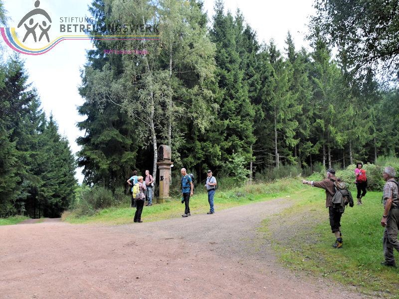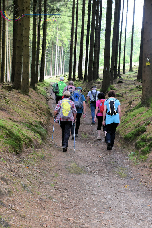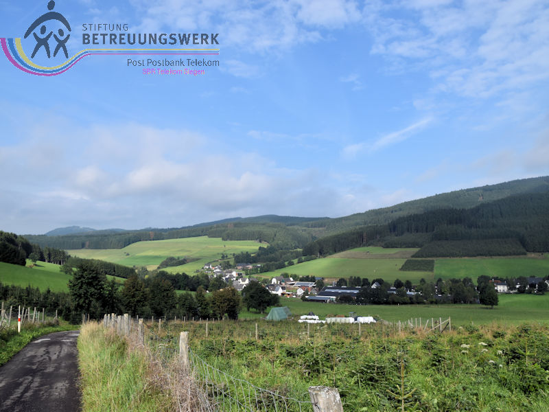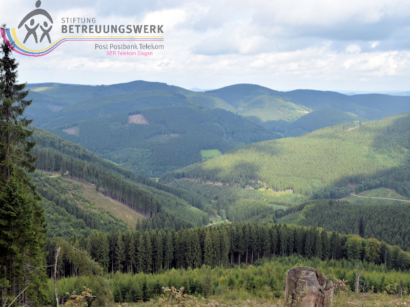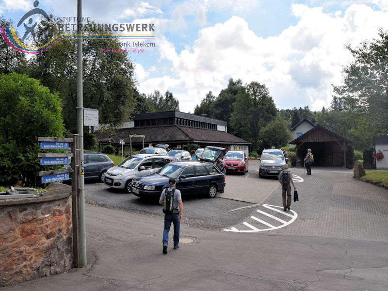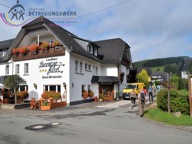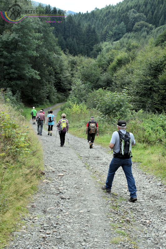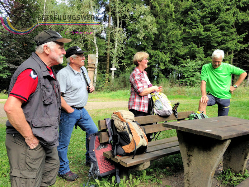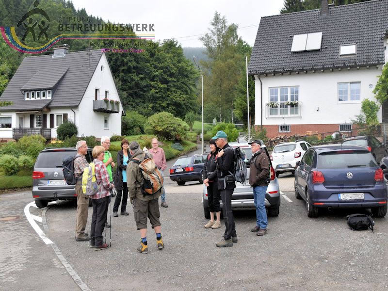 Der Treffpunkt zur anspruchsvollen Wanderung mit Rucksackverpflegung war auf dem Parkplatz am Haus des Gastes, Grubenweg 18 in 57399 Kirchhundem–Oberhundem. Die Wanderung wurde von Horst geführt, der uns 10 wanderfreudige SeniorenInnen zunächst herzlich begrüßte. Pünktlich gingen wir durch das ehemalige Golddorf-Oberhundem (1965 & 1973) mit seinen schönen Fachwerkhäusern los. Beim Gasthof zu den Linden und deren im April 2017 neu errichteten Baumhäusern gingen wir rechts hoch, um die erste längere Steigung in Angriff zu nehmen. Oberhalb Schloss Adolfsburg wanderten wir an der ehemaligen Kolping-Familienferienstätte Konrad-Adenauer-Haus (heute ein Hotel) und am Dorf Selbecke vorbei zum „Steinernen Kreuz“ (502 m), wo wir eine kurze Rast einlegten. Nun folgten wir dem Bergrücken Richtung Härdler (Berg 756 m) zum Alpenhaus (das Alpenhaus ist SGV mäßig die Essener Hütte). Horst führte uns über schöne Pfade mit vielen verschiedenen Pilzarten, die das Herz der Pilzkenner unter uns höher schlagen ließen. Am Alpenhaus angekommen erklärte Horst uns, wie auch während der ganzen Wanderung, wohin wir schauten. Wir hatten Glück, dass wir wieder gutes Wanderwetter hatten und wir auf der Terrasse des Alpenhauses unsere Mittagsrast einlegen konnten. So gestärkt, traten wir über eine sehenswerte Runde um den Kahleberg (Berg 711 m) mit Aussicht Richtung Saalhausen, Milchenbach, Schmallenberg, Bödefeld und Meschede, den Rückweg an. Auf unserer Wanderung passierten wir auch den Potsdamer Platz, aber nicht den in Berlin, in Kirchhundem kreuzen sich an diesem Platz mehrere Hauptwanderwege. Horst zeigte uns bei guten Fernsicht, die Windkrafträder von Hilchenbach, auf dem Stöppel, im Panoramapark. Sowie die Aussichtstüme Hohe Bracht und den Rhein-Weser-Turm und die Fernmeldetürme beim Rhein-Weser-Turm, auf der Hohe Hessel, auf der Kuhhelle (bei Meggen), auf der Hunau bei Bödefeld und nur sehr schwer erkennbar der Turm bei Meschede.