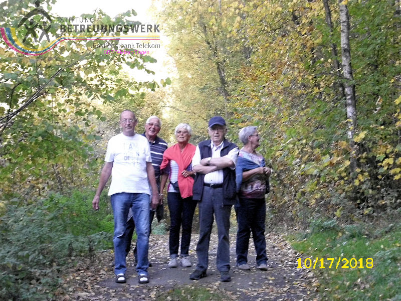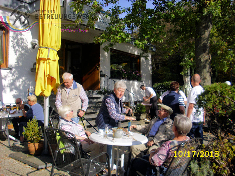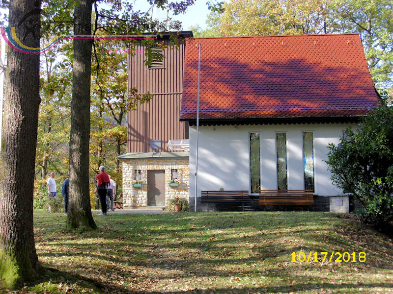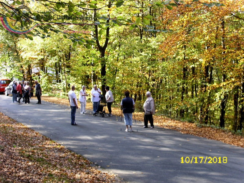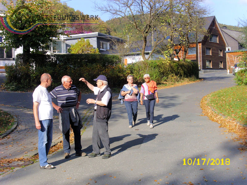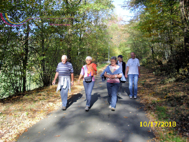 Einige der 16 Wandersleute waren am 17. Oktober 2018 so frühzeitig erschienen, um auf der sonnigen Terrasse des Landgasthaus Heinrichshöh noch in aller Ruhe einen Espresso schlürfen zu können. Schließlich zog der Tross in Richtung Staudamm los – auch neugierig bezüglich des Wasserstandes in der Obernautalsperre. Am Ende des Staudammes ging’s dann über den Wanderweg B1 hinab in den überwiegend ländlich geprägten Ort Brauersdorf. Über den Buswendeplatz und die Obernau stiegen wir gen Westen moderat aufwärts durch den bunten Laubwald zum Bergkopf „Leielchen“. Der kurze Abstecher nach links zur Waldkapelle lohnte sich ebenfalls; sie war offen und wir konnten eintreten. Hier erinnern die Fensterbilder der ehemaligen Kapellenschulen an die „versunkenen“ Ortschaften Obernau, Nauholz und den oberen Teil von Brauersdorf – geopfert dem lebenswichtigen Ziel: Trinkwassergewinnung.