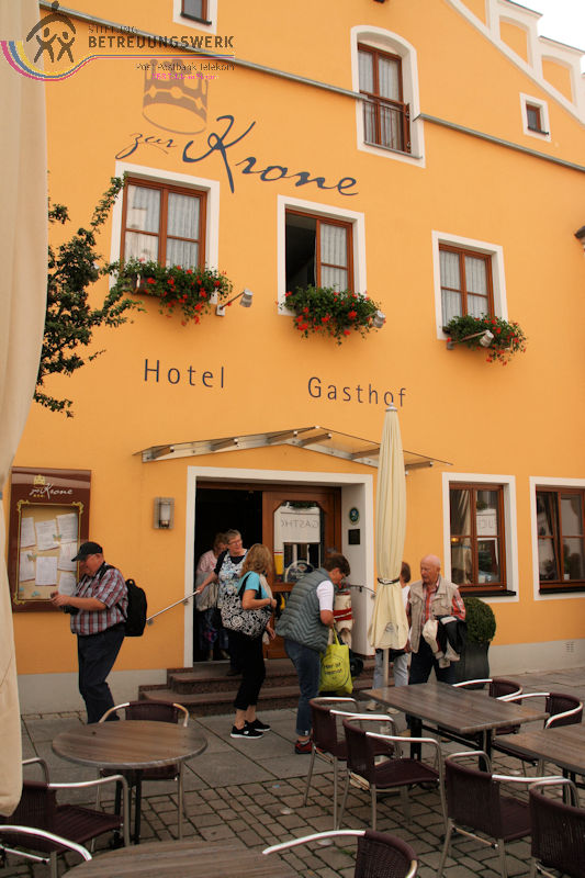 Dort im „Hotel Gasthof Zur Krone“ stand zunächst Arbeit an, denn das Reisegepäck musste in die Zimmer gebracht werden. Außer der Übernachtung war in der Hotelbuchung auch Frühstück und Abendessen enthalten. Nach dem heißen und anstrengenden Anreisetag wurde als erstes wohl von jedem Mitreisenden die Dusche benutzt. So konnten sich alle gut erfrischt und erwartungsfroh auf das Abendessen freuen. Das war auch zutreffend, denn das Küchenpersonal hatte sehr gute Arbeit geleistet. Das Getränkeangebot, vor allem die Weinkarte und das süffige Barock Dunkel der Weltenburger Brauerei schmeckten ausgezeichnet. Auch in den restlichen Tagen blieb das so.