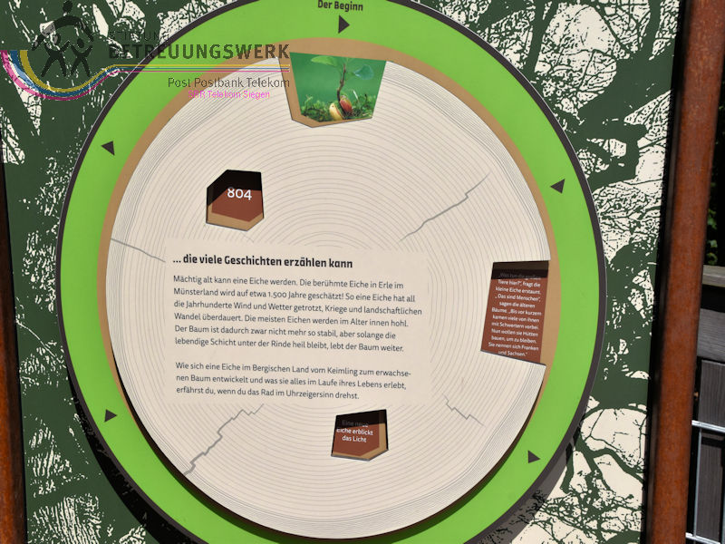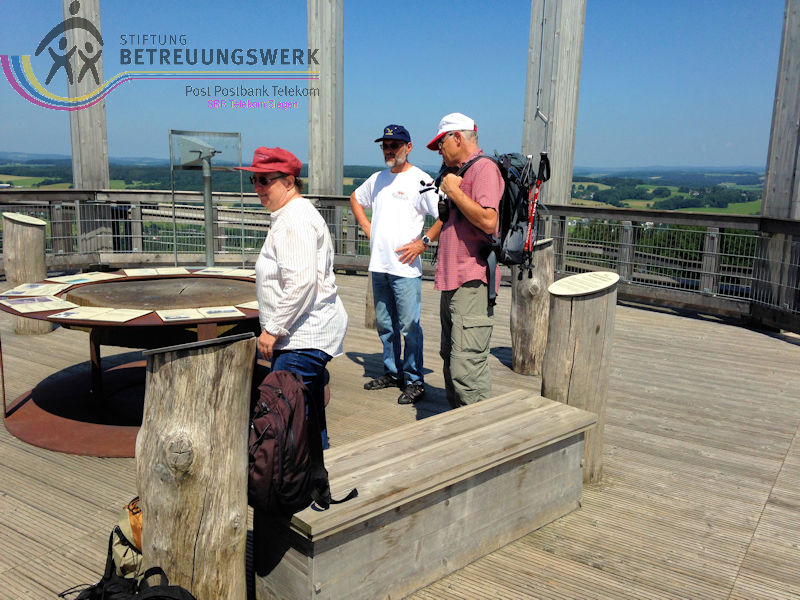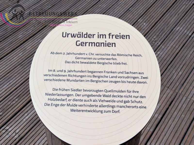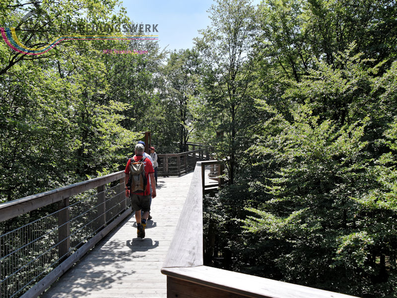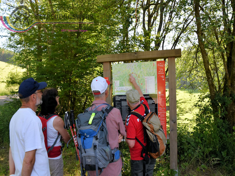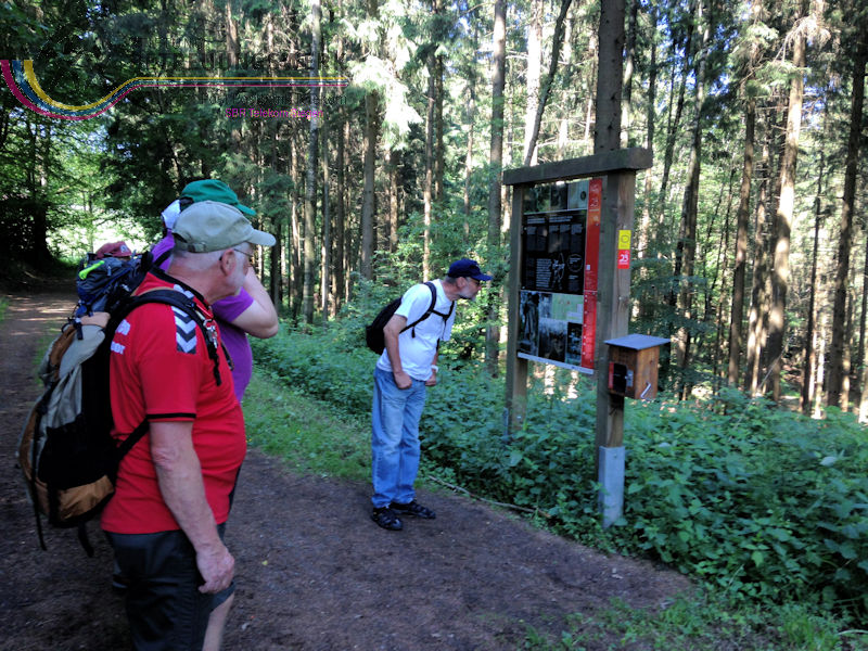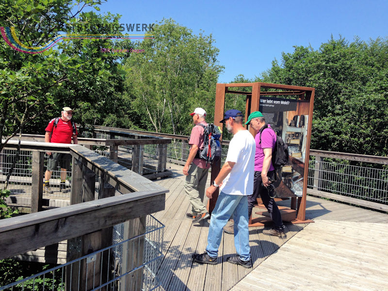 Treffpunkt zur Wanderung war auf dem Wanderparkplatz vor der „Vierbuchermühle“ südlich von Waldbröl. Nach der Begrüßung starteten wir die von Horst geführte Wanderung über den Waldmythenweg. Zunächst zeigte uns Horst jedoch den Weg der vor uns lag, anhand der auf dem Parkplatz befindlichen Info-Tafel. Dieser Weg ist der 23. Premiumwanderweg der „Bergischen Streifzüge“ und durchgängig mit der in weiß geschriebenen Zahl 23 auf rotem Hintergrund, gekennzeichnet. Auf dem gesamten Weg befinden sich elf solcher sehr informativen Hinweistafeln mit Geschichten zum Anhören, nachdem man durch Kurbeln die Technik in Gang setzt. Dies ist besonders für Kinder, eine interessante Angelegenheit. Erzählen diese Geschichten doch unter anderem von Elfen, Zwergen, Riesen, Hexen und Wölfen. Nach ca. 7 km verließen wir für die Besichtigung des Naturerlebnisparks „Panarbora“, den Mythenweg. Wir entschieden uns zuerst auf den 40 m hohen Aussichtsturm zu gehen. Die Aussichtsplattform befindet sich 34 m über dem Erdboden. Für den Turm wurden 870 m³ Holz und 200 t Stahl verbaut. Oben angekommen ließen wir uns Zeit die Fernsicht zu genießen. Nicht nur der Blick über das Bergische Land war faszinierend, sondern z.B. auch, dass wir bis zum Siebengebirge und zur Nordhelle schauen konnten. Natürlich ließen wir es uns nicht nehmen auch über den gesamten Baumwipfelpfad, der eine Gesamtlauflänge einschließlich Turmaufgang von 1.635 m, eine Höhe von bis zu 23 m über Grund und 6 interaktive Lerninseln hat, zu gehen. Anschließend galt es noch durch das Gelände, über den Sinnesweg zu gehen. Dabei legten wir unsere Mittagsrast in der dortigen Grillhütte ein. So gestärkt traten wir den Rückweg über den Waldmythenweg an und legten bei dem einem oder anderen Aussichtspunkt kleine Pausen ein. Bevor wir zu unserem Ausgangspunkt kamen, nutzten wir die Gelegenheit noch im Gasthof einzukehren. Wir 6 WanderInnen legten 15,3 km und 762 Höhenmeter zurück.