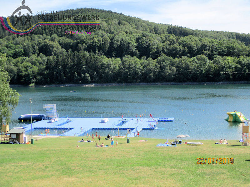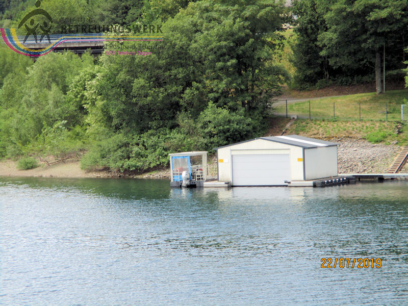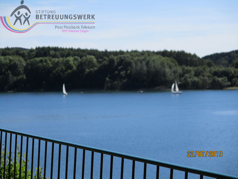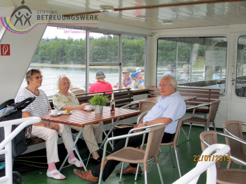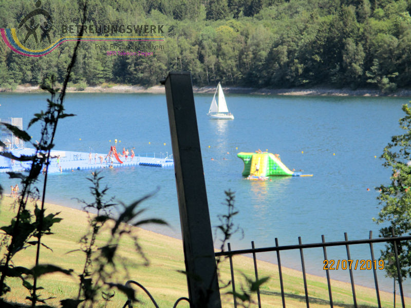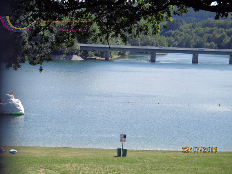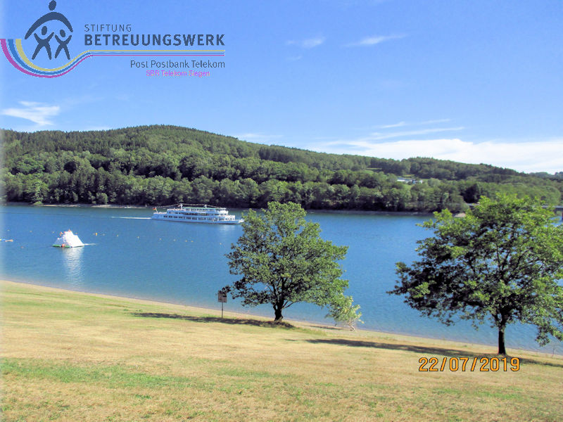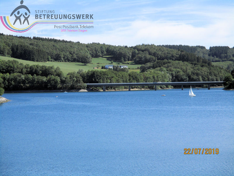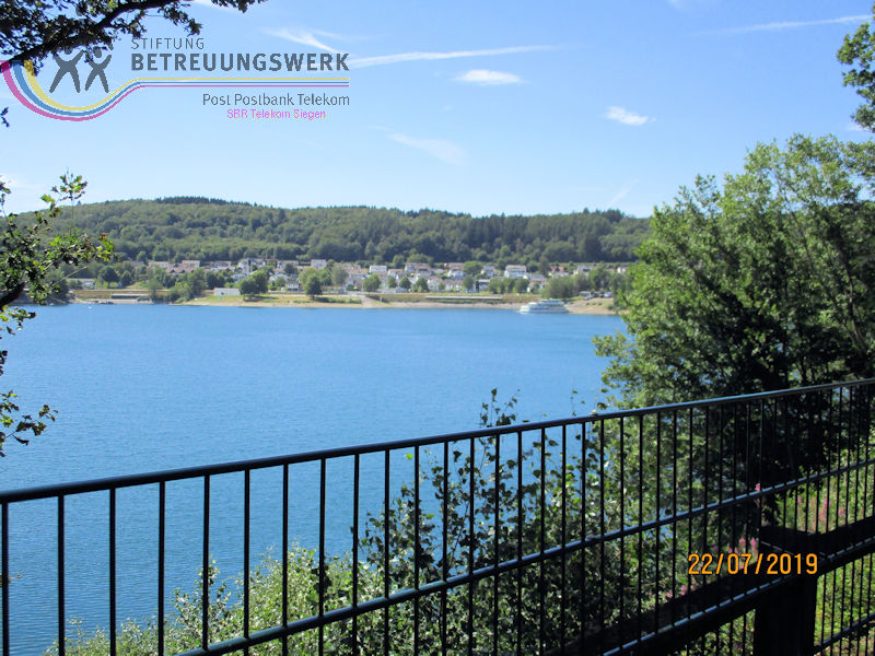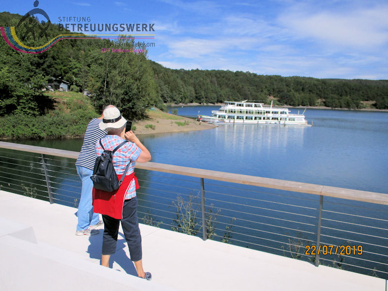 Mit einem guten Zeitpolster zur Abfahrt hatte man auf Bänken unter den Schatten spendenden Bäumen ausgeharrt – und vergeblich auf 2 „Leichtmatrosen“ gewartet, die ebenfalls an Bord gehen wollten. Entgegen der Planung war noch in der Anmeldephase der Vorschlag geäußert worden: lieber erst Schifffahrt und danach den Landgang anhängen für diejenigen, die noch Zeit und Lust haben. In kleinen Grüppchen scharte man sich auf dem Sonnendeck, um mit einem kühlen Getränk von hier die Natur und die Freizeitmöglichkeiten im und um’s Wasser zu beobachten. Dabei fiel uns die neugestaltete Außenanlage am Seebahnhof Sondern besonders ins Auge – nicht nur wegen der dürren Wiesen. Nach 1 ½ Stunden Fahrzeit mussten wir (leider) wieder von Bord; eine informative und dennoch entspannende Binnenseefahrt war zu Ende. Schnell löste sich unsere Gruppe auf: der größte Teil entschied sich zu ’ner kurzen Wanderung bergauf ins Café-Restaurant see:sicht. Zwei Landratten schlossen sich der Wanderführerin an, zum Spaziergang über den Uferweg (A5) zum Seebahnhof Sondern. Zunächst war da das Strandbad am Sonderner Kopf mit einer Tauchschule in der Nähe. Am Ufer entlang und immer mal wieder freier Sicht auf den See kamen wir nach gut 20 Minuten an der Seepromenade an, die nach der Neugestaltung für jeden Besucher mehr bieten kann. Auf gleicher Strecke ging’s zurück. Dabei haben wir noch mal Segler und Surfer, Kinder und Familien bei ihrem Freizeitvergnügen beobachten können. Erträglich war das nur von einem schattigen Standort aus. Und zu guter Letzt: Gerade in unserer Trocken- und Hitzeperiode sollte uns bewusst sein, dass die Talsperren das Vorhandensein von sauberem Trinkwasser absichern.