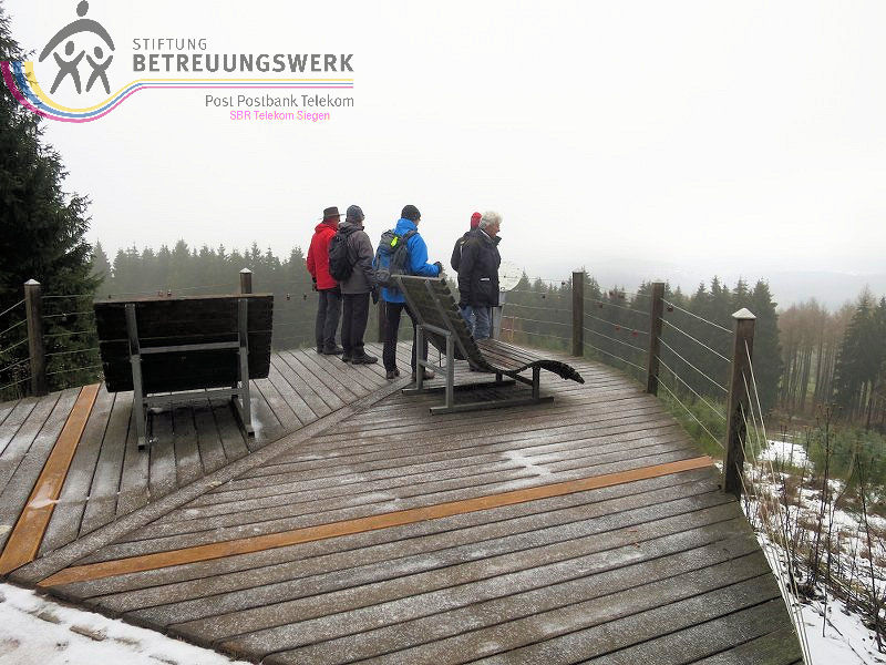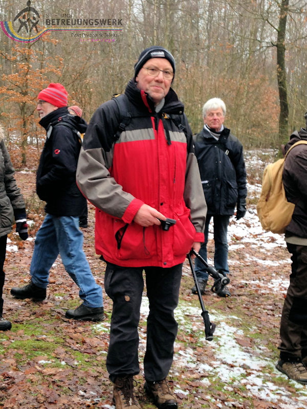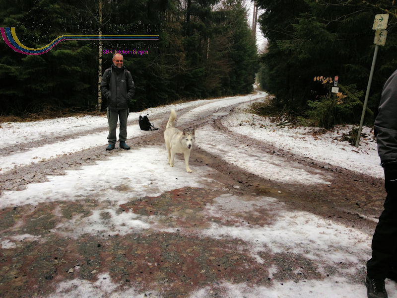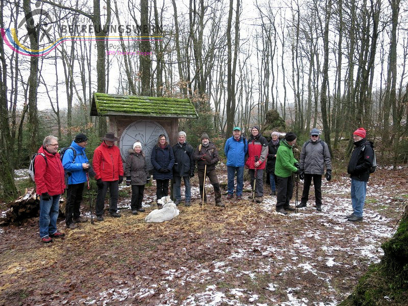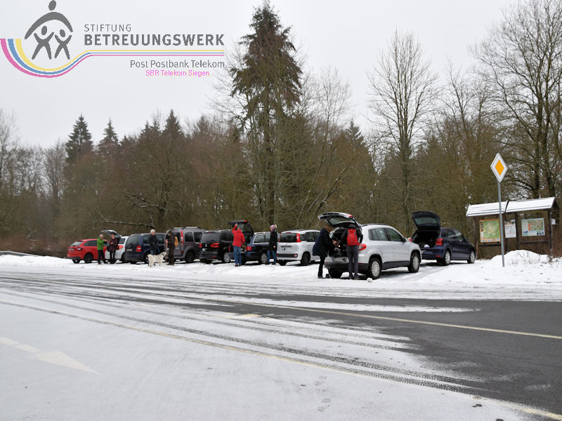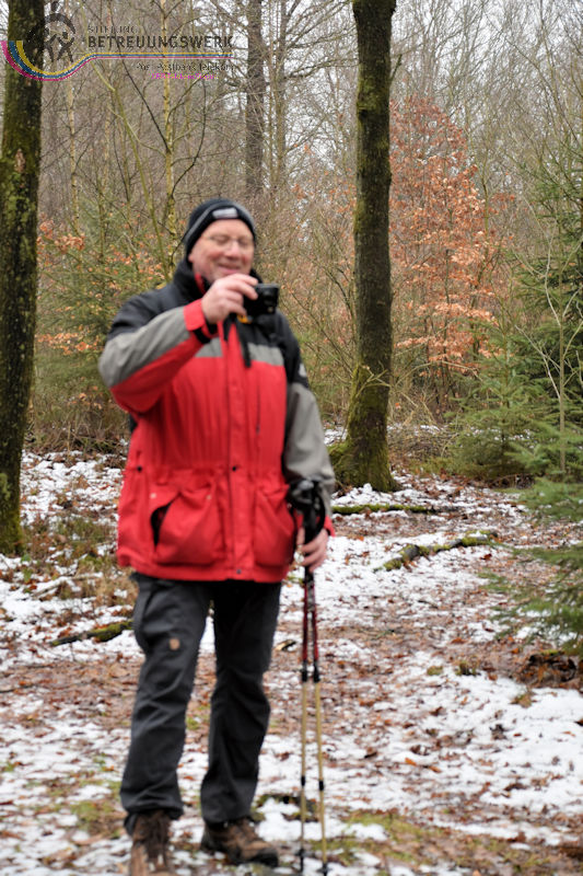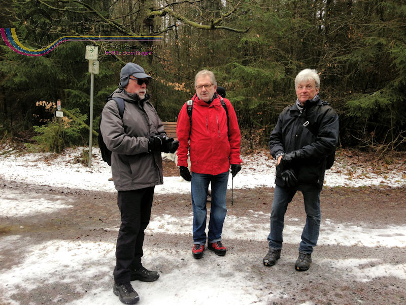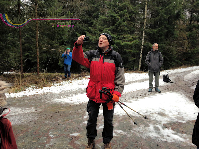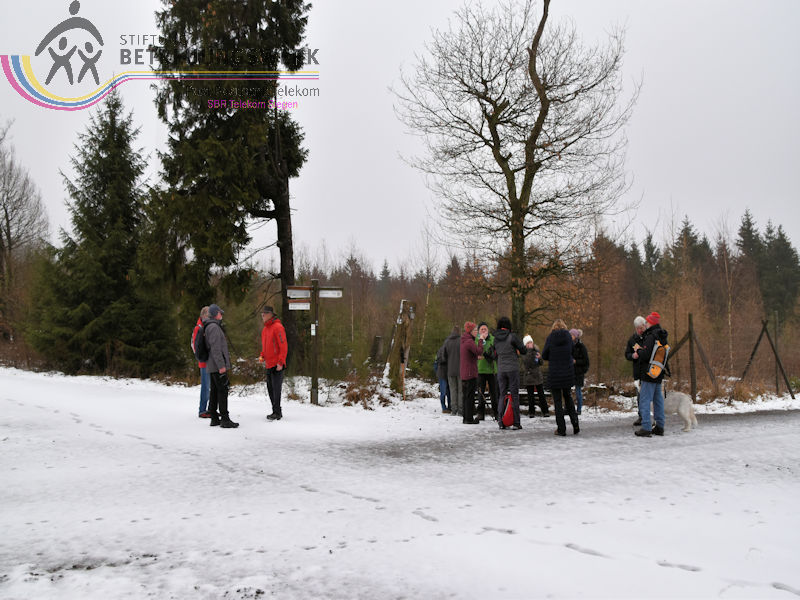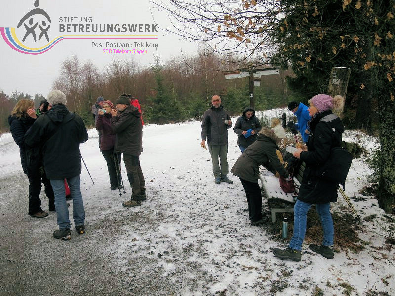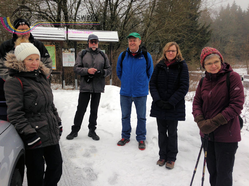 Mit 17 Personen begann, nach der Begrüßung und kurzen Erläuterung zu der vor uns liegenden Wanderstrecke durch unseren Wanderführer Bernd, die Wanderung vom Parkplatz Kalteiche (Kreuzung B54/L904). Zunächst folgten wir ein kurzes Stück „Auf Bergmannspfaden rund um die Kalteiche“ und folgten im weiteren Verlauf überwiegend dem Wanderzeichen des Rothaarsteigs. Als wir zu einen „Buswartehäuschen“ kamen, folgten wir dem Weg rechts bergab. Am Rückweg kamen wir auf einem anderen Weg erneut daran vorbei und nahmen die mit, die in der Zwischenzeit dort vergeblich auf einen Bus gewartet hatten. Auf eine gute Fernsicht mussten wir leider verzichten, freuten uns jedoch über die Schneelandschaft und das trockene Wetter. Bernd zeigte uns dennoch die verschiedenen Fernsichten, nach Hessen und ins Siegerland. Als wir den Aussichtspunkt „Tiefenrother Höhe“ erreichten, hatte sich das diesige Wetter leider noch immer nicht verzogen, doch wir konnten uns vorstellen, wie schön es sein muss, dort im Sommer auf der Bank sitzend diese tolle Aussicht zu genießen. Einen kleinen Abstecher legten wir noch durch den „Historischen Hauberg“ ein, dem Haubergspfad, wo wir spontan ein Gruppenfoto machten. Natürlich legten wir auch eine Bananenpause ein, bevor es durch den verschneiten Wald weiterging. Nach 12,2 Kilometern und 363 Höhenmetern erreichten wir unseren Ausgangspunkt und können stolz sagen, wir sind von NRW bis ins Hessische und wieder zurück gewandert.