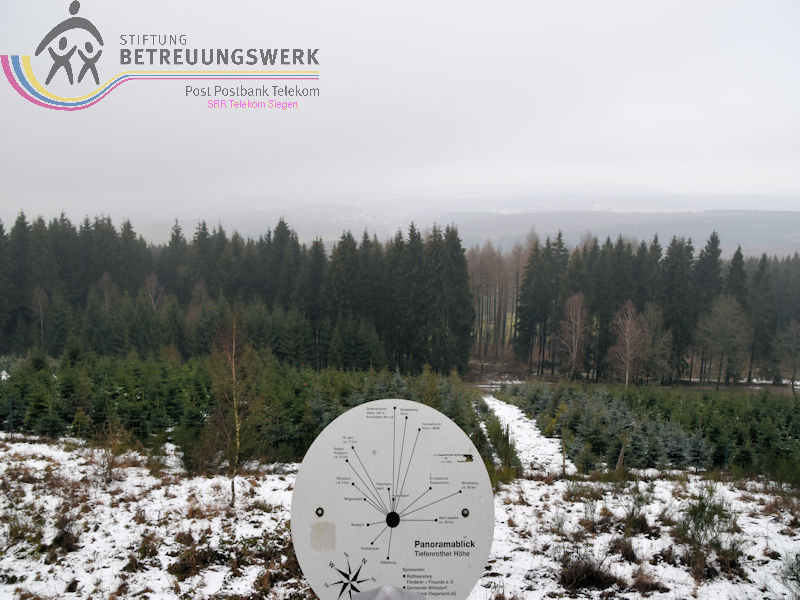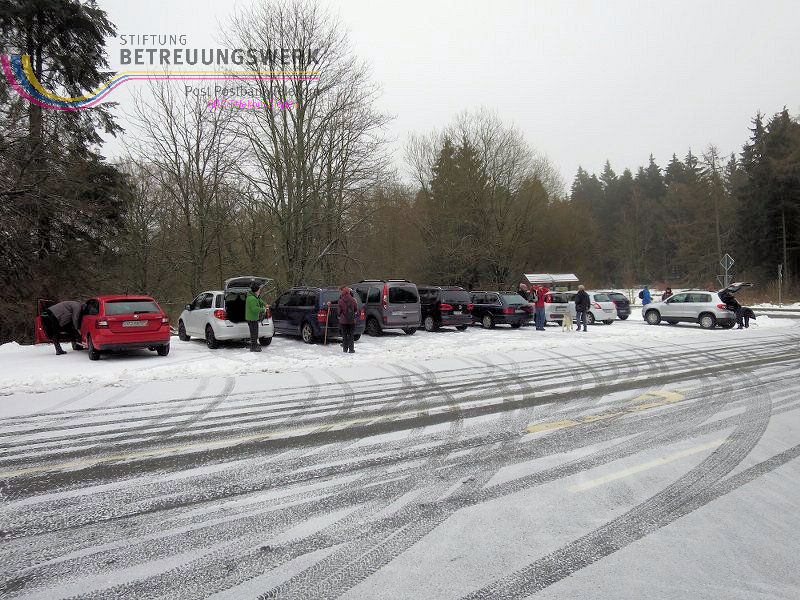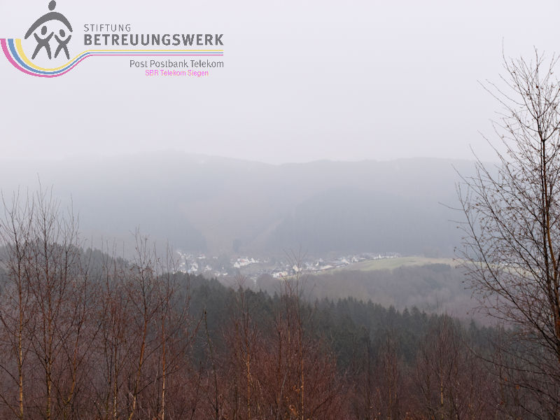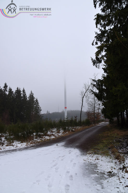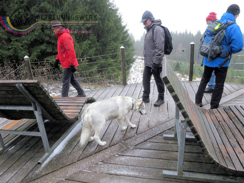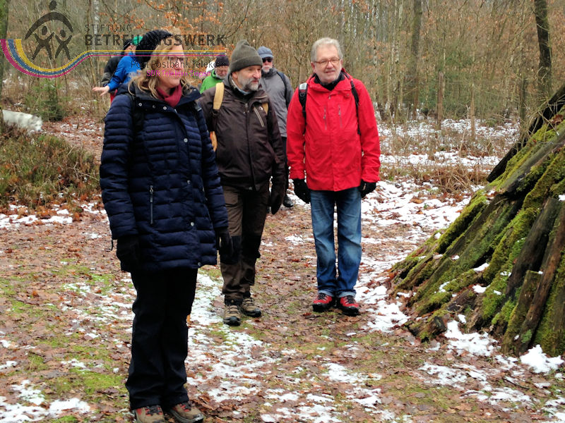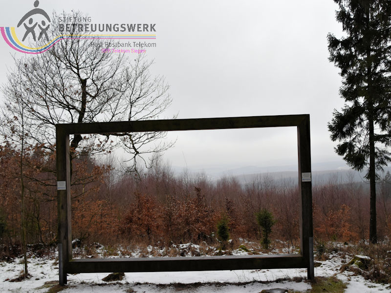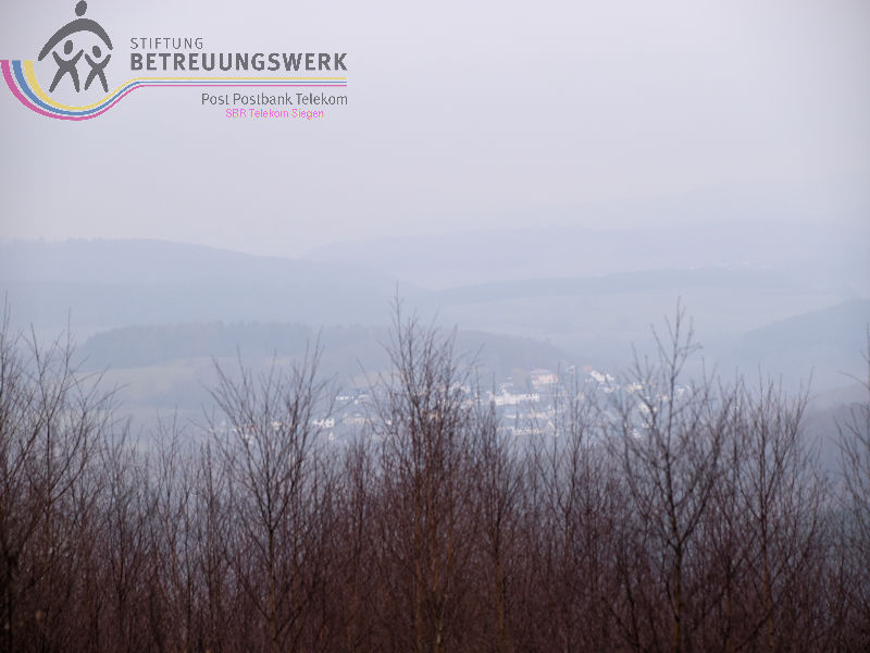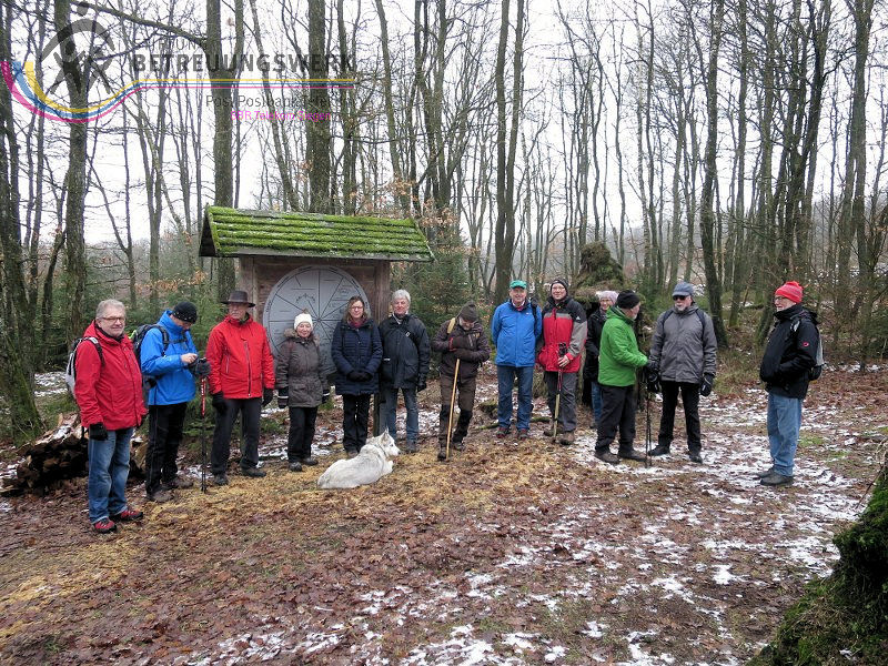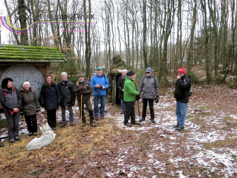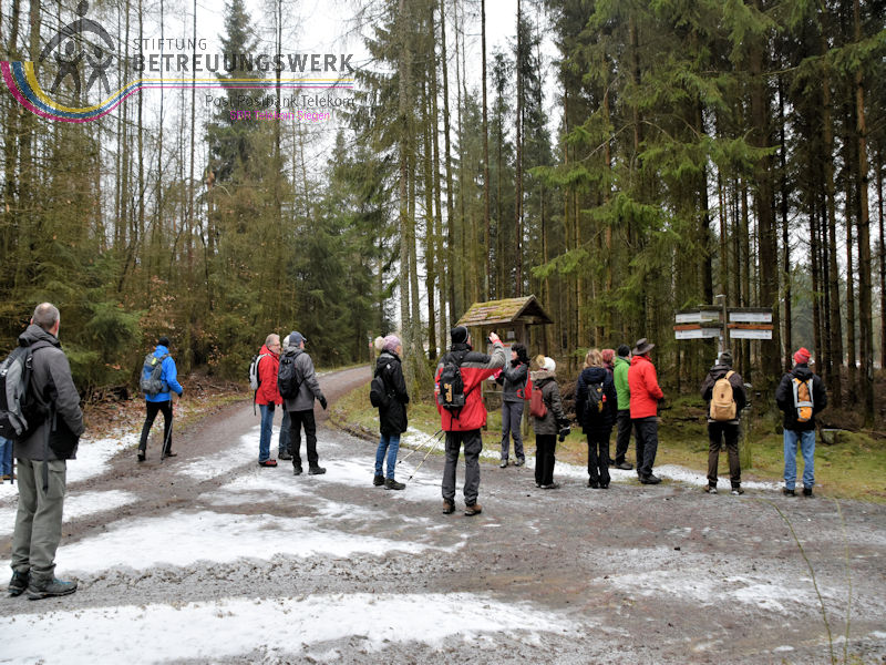 Mit 17 Personen begann, nach der Begrüßung und kurzen Erläuterung zu der vor uns liegenden Wanderstrecke durch unseren Wanderführer Bernd, die Wanderung vom Parkplatz Kalteiche (Kreuzung B54/L904). Zunächst folgten wir ein kurzes Stück „Auf Bergmannspfaden rund um die Kalteiche“ und folgten im weiteren Verlauf überwiegend dem Wanderzeichen des Rothaarsteigs. Als wir zu einen „Buswartehäuschen“ kamen, folgten wir dem Weg rechts bergab. Am Rückweg kamen wir auf einem anderen Weg erneut daran vorbei und nahmen die mit, die in der Zwischenzeit dort vergeblich auf einen Bus gewartet hatten. Auf eine gute Fernsicht mussten wir leider verzichten, freuten uns jedoch über die Schneelandschaft und das trockene Wetter. Bernd zeigte uns dennoch die verschiedenen Fernsichten, nach Hessen und ins Siegerland. Als wir den Aussichtspunkt „Tiefenrother Höhe“ erreichten, hatte sich das diesige Wetter leider noch immer nicht verzogen, doch wir konnten uns vorstellen, wie schön es sein muss, dort im Sommer auf der Bank sitzend diese tolle Aussicht zu genießen. Einen kleinen Abstecher legten wir noch durch den „Historischen Hauberg“ ein, dem Haubergspfad, wo wir spontan ein Gruppenfoto machten. Natürlich legten wir auch eine Bananenpause ein, bevor es durch den verschneiten Wald weiterging. Nach 12,2 Kilometern und 363 Höhenmetern erreichten wir unseren Ausgangspunkt und können stolz sagen, wir sind von NRW bis ins Hessische und wieder zurück gewandert.